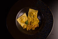 Razviti testo, formirati raviole i puniti musom. Kuvati u ključaloj vodi oko 3 minuta, zatim ih propržiti minut na srednje zagrejanom tiganju s puterom. Servirati raviole, preliti sosom i ukrasiti listom sveže nane.