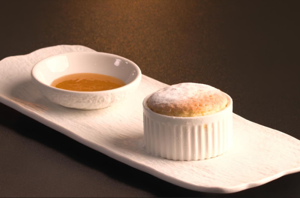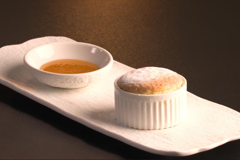 Aleksandar je ovaj ukusni dezert nazvao "Egzotična alhemija", a u pitanju je sufle od bele čokolade, ružine vodice i limete, sa sosem od marakuje.