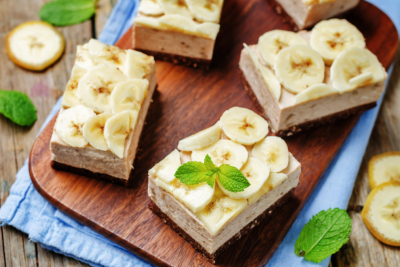 Dok se to peče, banane izgnječite štapnim mikserom, otopite preostalih 100 grama čokolade, pa pomešajte sa bananama. Kad se kora prohladi, prelijte dobijenim filom od banana i stavite u frižider da se stegne.