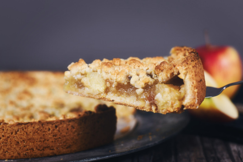 Započnite sa suvom smesom – ravnomerno je rasporedite po dnu. Zatim stavite sloj naribanih jabuka (pustite da puste svoj sok). Ponovite postupak još jednom ili dva puta (zavisi od veličine tepsije), završavajući sa suvom smesom.