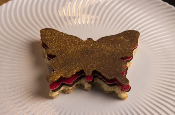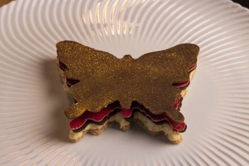 Sastoji iz nekoliko komponenti: dve vrste temperirane čokolade (crne i rubi za čije se temperiranje koriste potpuno različite temperature), piškote od lešnika, kulija od jagode sa crvenim biberom, poslastičarskog žutog krema sa infuzijom svežeg bosiljka, semi freda sa ružinom vodicom i keksa od pržene rubi čokolade.