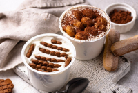 Potopile smo keksiće u instant kafu, a potom smo ih vratila u čašu s jogurtom. Kolač smo dekorisale kakaom, višnjama i orasima.