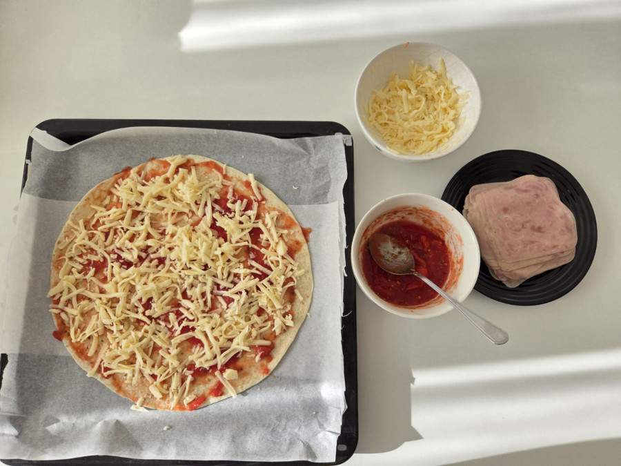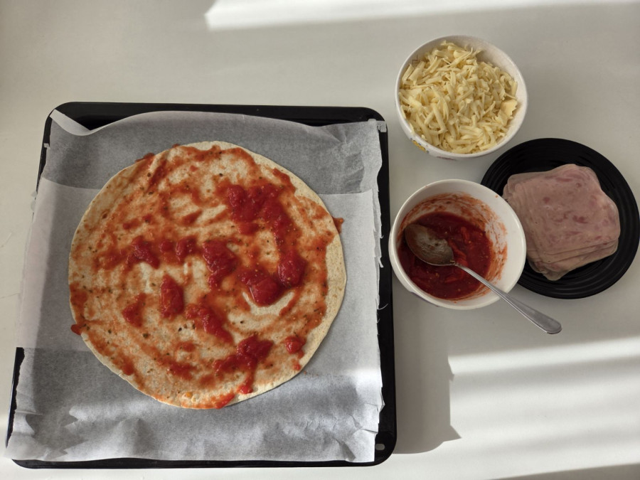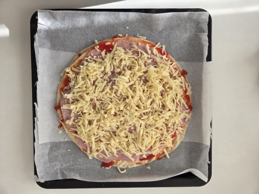Na papir za pečenje stavljamo jednu tortilju, pa je premazujemo našim pelatom. Nakon toga, stavljamo polovinu izrendanog kačkavalja i ovu konstrukciju preklapamo drugom tortiljom.