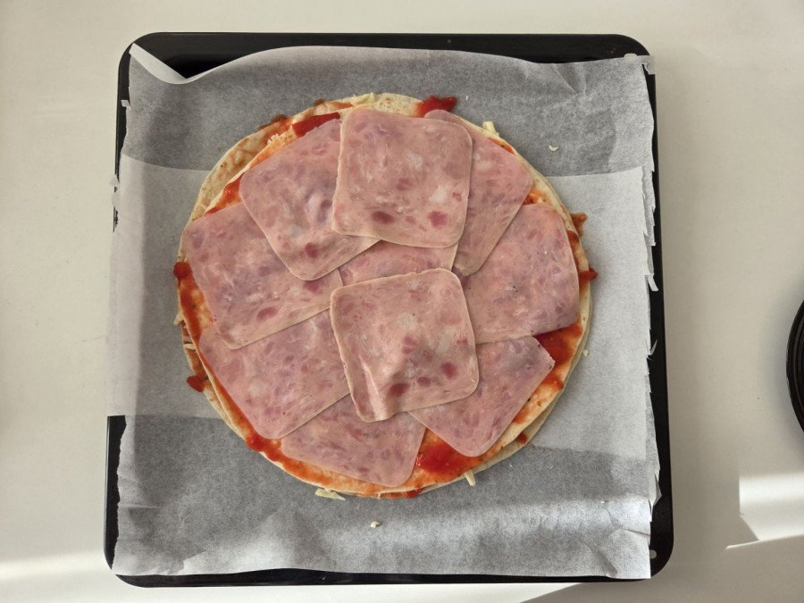 Drugu tortilju premazujemo ostatkom pelata, stavljamo šunku, pa stavljamo ostatak kačkavalja, i to je sva filozofija!