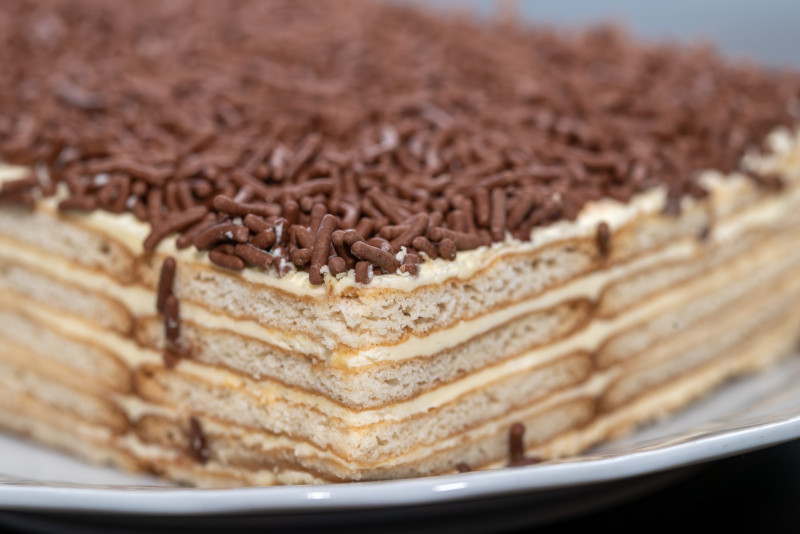 Tajna je u kremastom čokoladnom punjenju koje veže keks u savršenu celinu i posle noći u frižideru seče se kao pravi kolač, ravno i čisto, bez mrvljenja.