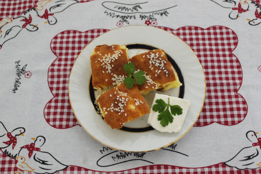 Masa treba da je žitka, nešto gušća od testa za palačinke. Sve to varjačom izmešati i sipati u tepsiju podmazanu mašću (ako postite umesto masti koristite biljno ulje) staviti u unapred zagrejanu rernu, na 230 stepeni C, i peći oko 15-20 min. tj, dok se na površini ne uhvati tamnosmeđa korica.