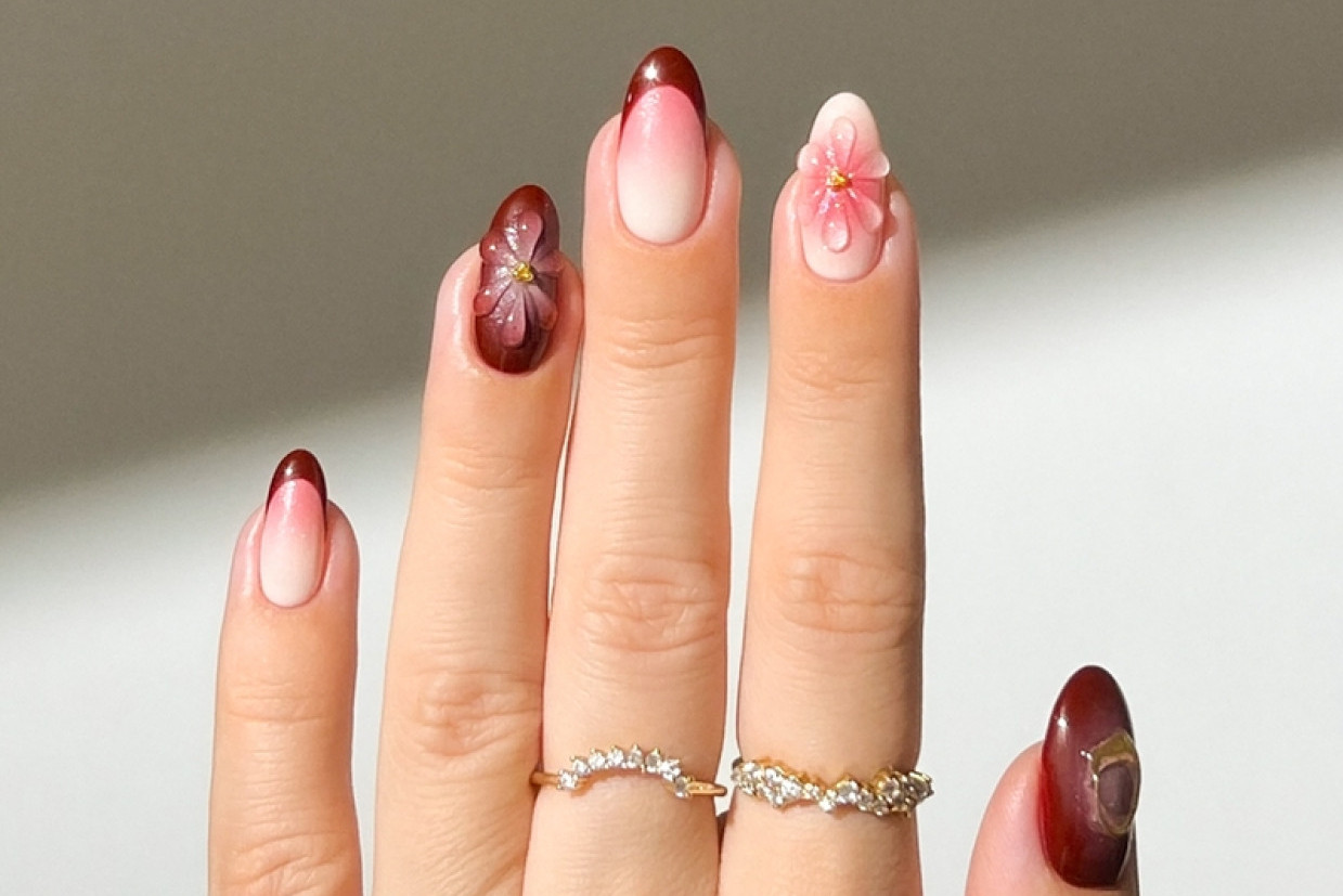 3D dizajni i dalje su u trendu, a u kombinaciji sa burgundy ombré efektom postaju apsolutno stylish i ekstravagantni. Za trodimenzionalne efekte birajte "hladnije" nijanse ili beli lak preko kojeg dodate chrome prah za metalik finiš – savršeno se slaže sa tamno crvenom bazom i daje efekat koji pleni pažnju.