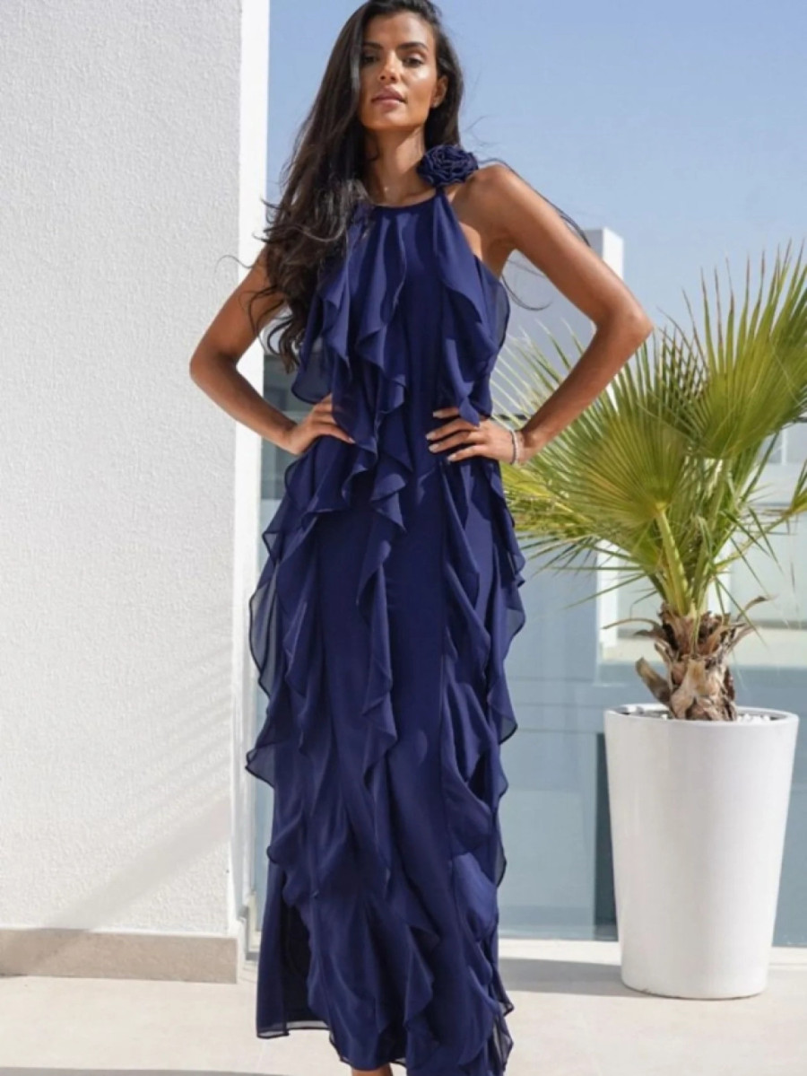 Elegantna duga haljina bez rukava u tamnoplavoj boji sa volanima koji padaju niz celu dužinu haljine. Jedno rame je ukrašeno diskretnim cvetnim detaljem koji je odvojiv. Izrađena od laganog lepršavog materijala, ova haljina pruža udobnost i slobodu pokreta. Idealna je za večernje izlaske ili svečane izlaske.