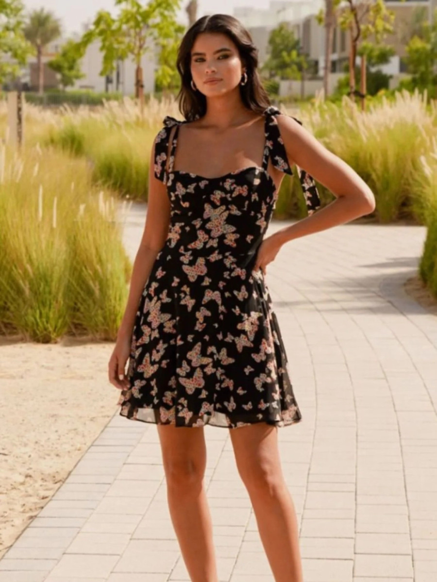Lepršava i razigrana, ova kratka haljina s crnom podlogom ukrašena šarenim printom leptirića idealna je za tople letnje dane. Model na bretele koje se vezuju na ramenima pruža dodatnu dozu šarma i prilagodljivosti, dok blago zvonasti kroj suknje omogućava udobnost i slobodu pokreta. Savršen izbor za dnevne šetnje, kafu u gradu ili letnje žurke na otvorenom.