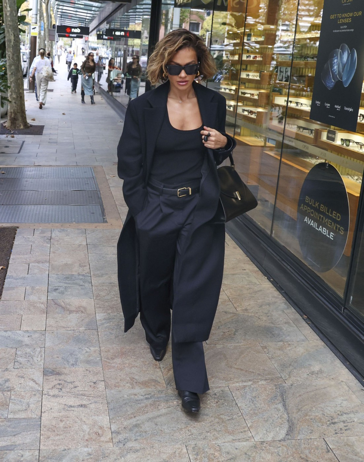 Paparaci su je uslikali u poslovnoj kombinaciji - crnom kaputu, pantalonama i majici u istoj boji, a celokupnu kombinaciju je upotpunila torbicom brenda "Feragamo".