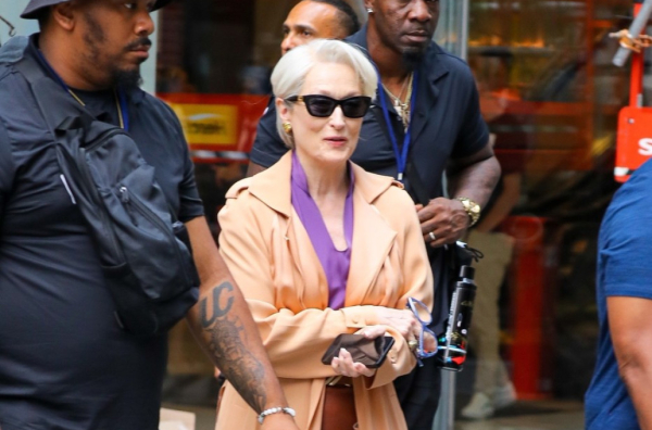 Na snimanju drugog dela "Đavo nosi Pradu", Meril je prošetala u narandžastoj kožnoj suknji i ljubičastoj bluzi sa V izrezom.