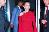 Zvezda serije "Only Murders in the Building" i osnivačica brenda "Rare Beauty" prošetala je Njujorkom u upečatljivoj crvenoj mini-haljini, spuštenih ramena s potpisom brenda "Cult Gaia", prenosi "Vogue".