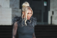 Ovog puta, odlučila se za dramatičan izgled. Pojavila se u sivoj pripijenoj haljini koja ima perje po rubovima, a prozirna je pa njene obline i mišići jasno dolaze do izražaja.