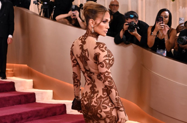 Reč je o providnoj haljini Jean-Louis Scherrer Haute Couture iz kolekcije za 2023. godinu, a krasi je sirena kroj, kao i detalji u braon boji koji su bili ključni deo. Naime, latino diva nije nosila donji veš, ali ni brushalter, te su ovi zanimljivi dekorativni oblici prekrili njene intimne delove tela.