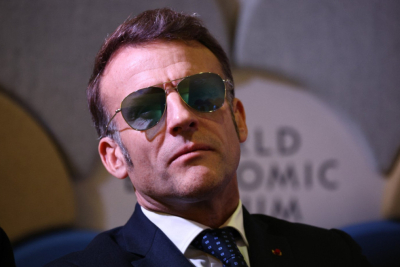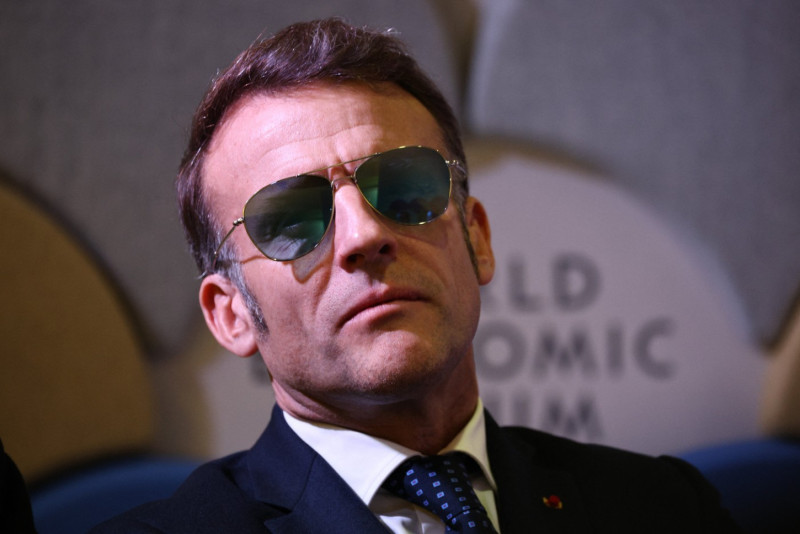 Francuski predsednik Emanuel Makron obratio se Svetskom ekonomskom forumu u Davosu noseći plave pilotske sunčane naočare sa ogledalima.