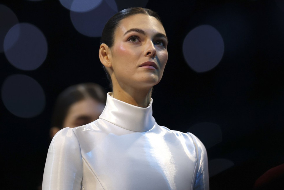 Manekenka je nosila dugu, belu, po meri rađenu Armani Prive haljinu, sa dramatičnim dugim rukavima i visokim vratom, dok je predavala italijansku zastavu odmah nakon nastupa pop legende Maraje Keri, prenosi Vogue Italia.