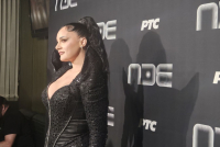 Odabrala je crnu haljinu sa dubokim dekolteom koja prati liniju tela i ističe zavidnu figuru. Primetne su bile i predimenzionirane naramenice koje su celokupnom stajlingu dale jednu mračnu notu.