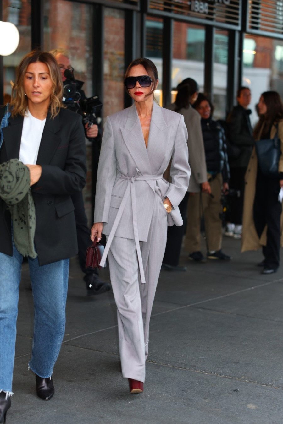 Viktorija je prošetala u modernom sivom odelu širokih nogavica. Gornji deo je činio malo duži sako na preklop, a mašnom je dizajnerka naglasila struk. Naočare za sunce su njen zaštitni znak, pa ni sada nisu izostale.