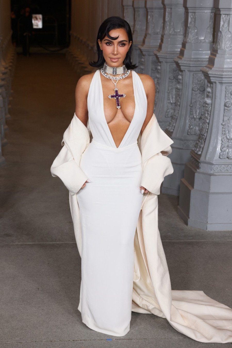 Pojavila se u atraktivnoj beloj "Guči" toaleti s izrezom sve do pupka koji jedva pokriva njene grudi, a ljudima je upala u oči raskošna dijamantska ogrlica s velikim krstom koji je nosila princeza Dajana 1987. godine, a Kim ga je nosila na bisernom čokeru.