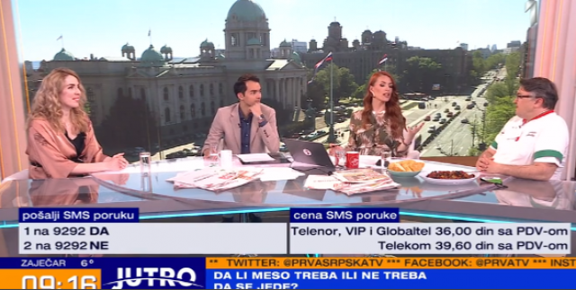 Možemo li da živimo bez proteina u mesu? Ko je upravu, da li meso treba ili ne treba da se jede, bila je tema ovog "Jutra" TV Prva. Gosti emisije bili su Aleksandro Kremenjani, kuvar i najpoznatiji pobornik zdrave ishrane i Borjana Depalo, nutricionista, a u emisiju se uključio i Milan Stojanović, čiji otac je kuvao za Tita.