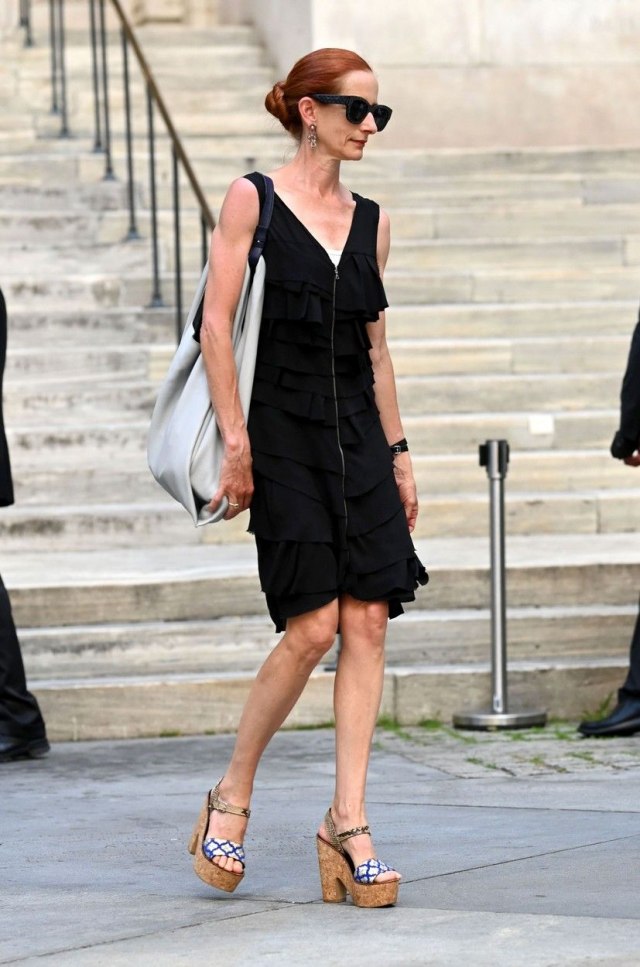 Mala crna haljina, sandale na platformu i oversajz tašna.