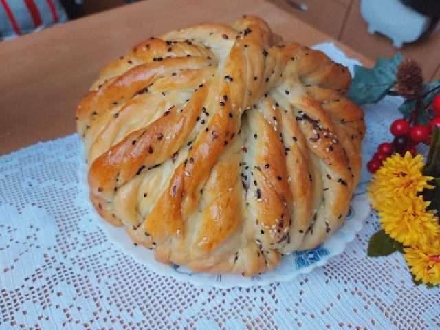 Uvijati valjak oko prstiju kao kad motate klupko. Zadnju loptu razviti i premazati uljem i posuti susamom i kimom. Iseći kao i prethodne i uviti odozgo preko uvijenih traka i formirati veliko klupko.