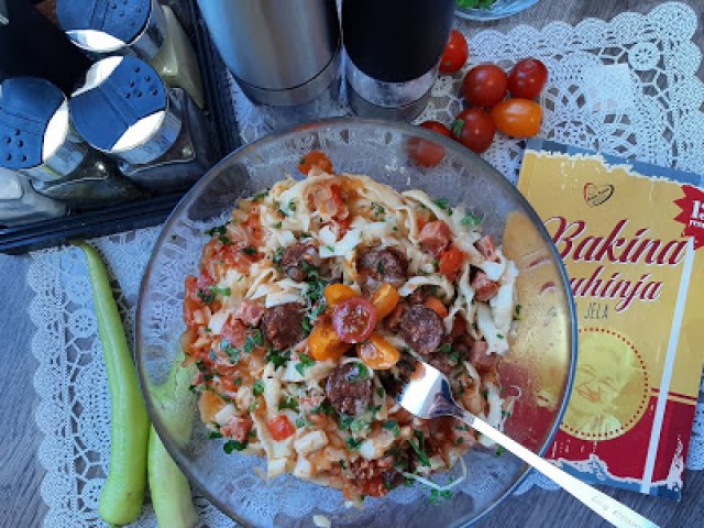 Priprema: Na ulju propržiti seckan luk, dodati seckanu papriku i na kolutove isečene kobasice. Pržiti oko 15 minuta na tihoj vatri. Ubaciti beli luk i paradajz seckan na kocke. Posoliti i pobiberiti. Ubaciti pola u rezance, promešati, pa onda dodati i drugu polovinu.