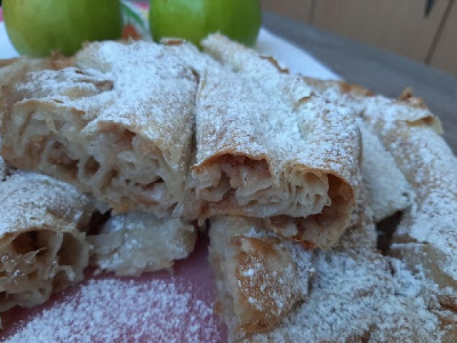 Ruke malo premažete uljem i zavučete šake ispod testa sa prstima nadole i polako podižete testo uvis, širite ga i razvlačite sredinu. Spustite ga na sto i rukama razvlačite krajeve ukrug do preko stola. Testo se lepo razvlači kao žvaka. Pokidajte ivice razvučenog testa. Pouljite testo još malo i razbacajte rendane jabuke koje ste malo pošećerili i zamirisali cimetom.