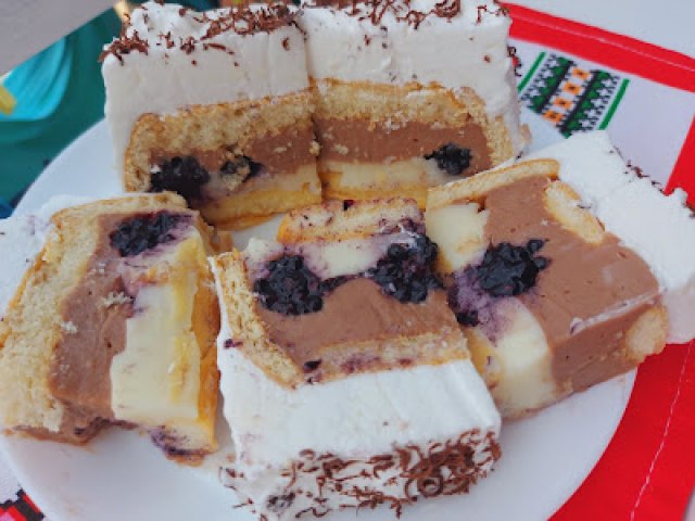 Ohlađen izvrnuti na pleh skloniti foliju pa ukrasiti šlagom.