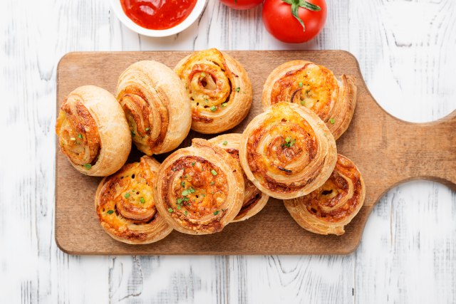 Testo razvucite u pravugaonik i filujte. zatim, uvijte u rolat i secite komade debljen eoko 5 cm.