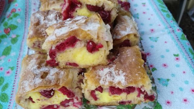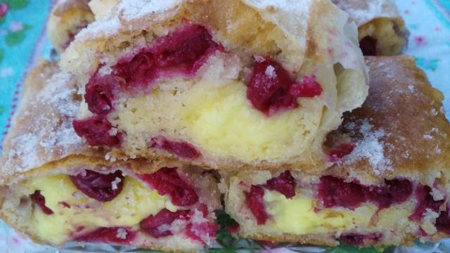 Na treću koru dodate višnje po celoj površini i na donjem delu kore dodajte pudning kao što je prikazana na video-snimku. Savijete stranice i uvijete u rolat. Stavite u pleh koji ste obložili pek-papirom.