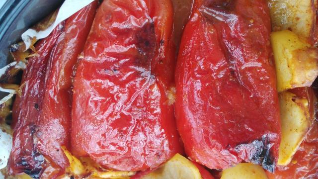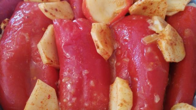 Puniti paprike i ređati u đuveč. Paprike možete zatvoriti paradajzom ili listovima krompira. Prelijte ih malo sa uljem i pecite na 200 stepeni C oko 30 minuta da se lepo zapeku. Ako je ostalo pasulja sipajte ga u đuveč, pa i njega zapecite sa paprikom. Prijatno!