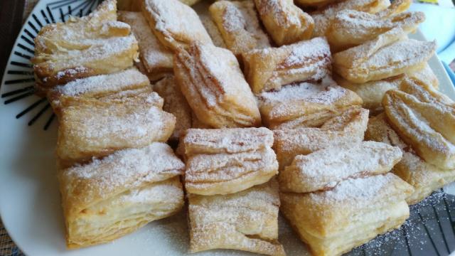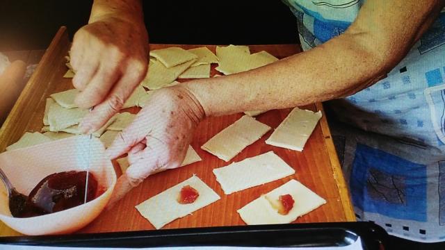 Kad je treći put namazano i odmarilo, testo razviti što tanje i seći po želji, staviti džem, presaviti i pritisnuti prstom ispod džema malo, kako džem ne bi iscurio.