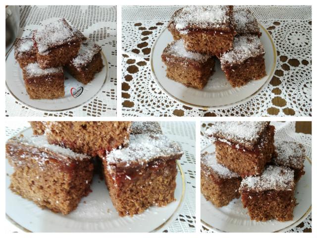 Sve dobro izjednačiti i sipati u podmazan pleh. Peći na 200 stepeni C oko 30-40 min. Vruć kolač premazati džemom, a kad se malo još ohladi premazati otopljenom čokoladom. Seći hladan.