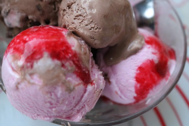 Umutiti slatku pavlaku, dodati umućenu šlag penu i kiselu pavlaku. Podeliti napola, u jedno dodati sok od malina, u drugo otopljenu čokoladu i keks i sve izjednačiti. Razliti u plastični kutiju, zatvoriti i zamrznuti.