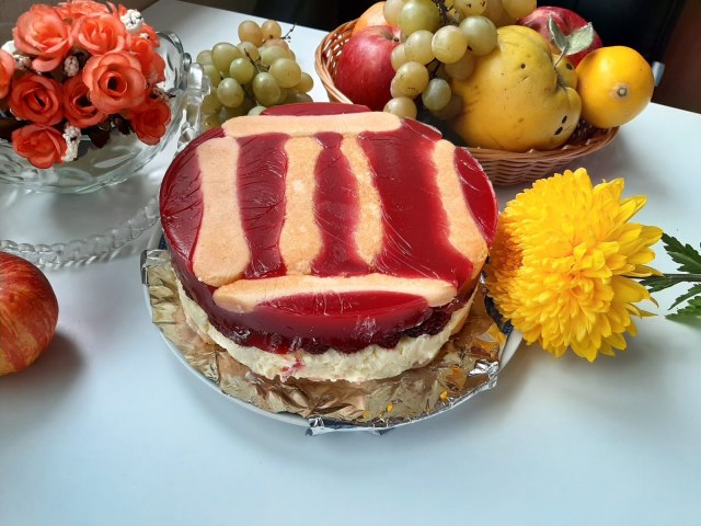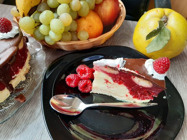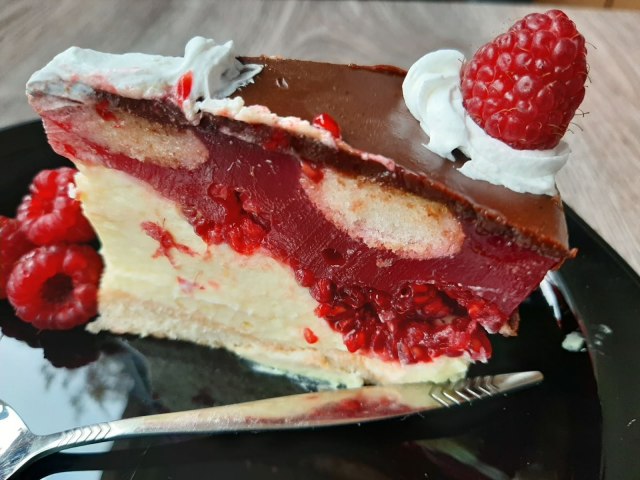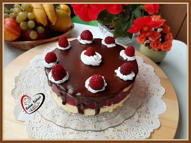 Istresti na tanjir pa tortu preliti čokoladom.. Može se ukrasiti šlagom i malinama.