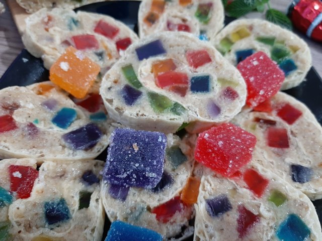 Oblandu izvaditi iz krpe pa je premazati celokupnim filom posuti seckanIm žele bombonama i uviti u rolat. Ostaviti da se dobro ohladi i seći.