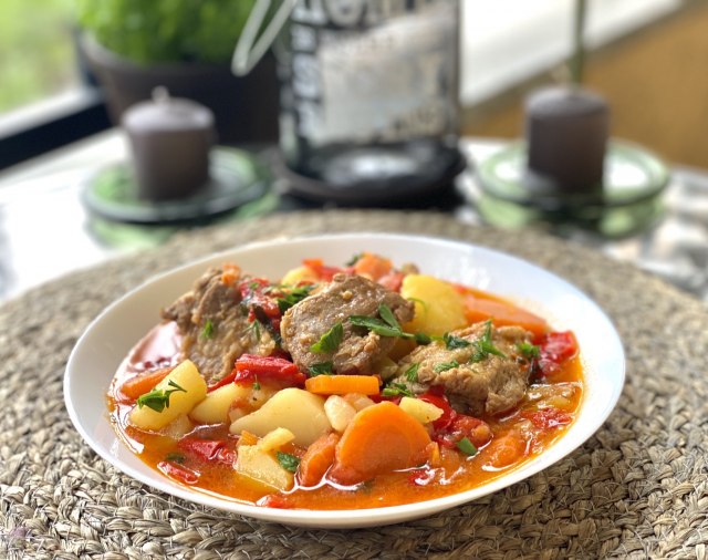 Upržiti na ulju crni luk, šargarepu, paškanat i mladi beli luk. Zatim dodati meso, začiniti po ukusu, preliti sa 50 ml vode, poklopiti šerpu i ostaviti da se kuva nekih 15 minuta, na umerenoj temperaturi. Nakon toga dodati svežu crvenu papriku, krompir, i paradajz. Sve lepo začiniti, naliti sa 1,5 vode i ostaviti da se kuva 45 minuta.