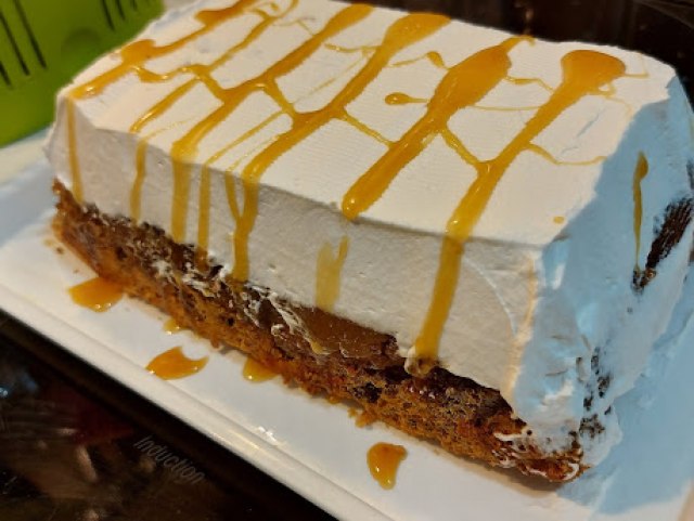 Pečen kolač ohladiti, pa izvrnuti na poslužavnik tako da jabuke budu odozgo. Na ohlađen kolač dodati šlag ili umućenu slatku pavlaku.