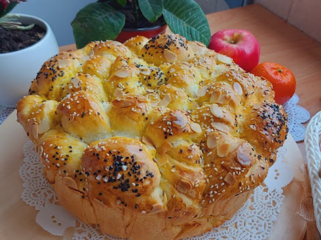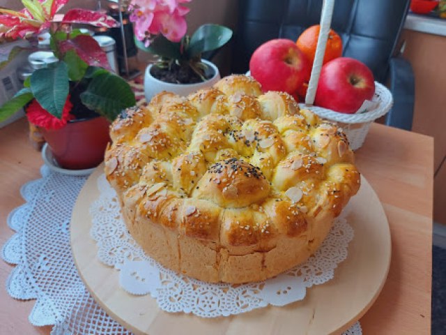 Ređati u okrugli pleh 28 cm prečnika koji ste podmazati uljem. Pogaču odmoriti pa je premazati sa žumancetom u koji ste stavili kašiku mleka i malo maslinovog ulja. Posuti susamom, i krupnom solju. Peći na 180 stepeni 50-60 minuta.
