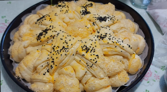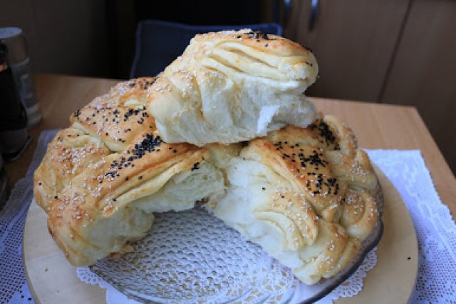 Priprema: Mleko ugrejati, dodati izdrobljen kvasac, šećer, brašno i so. Zamesiti srednje testo da se ne lepi i dobro ga obraditi rukama (bar 7-8 min ga mesiti.) Pokriti da odmori 30 min. Testo podeliti na 4 loptice i ostaviti jednu malu za sredinu. Svaku lopticu obraditi rukama i pokriti 5 min. Razviti prvu loptu okruglo , premazati maslacom i podeliti na 8 trouglova i malo ih zaseći prema uglovima dva puta. Uviti u kifle. Rasporediti u podmazanoj tepsiji. I drugu loptu na isti način a kifle ređati između prvih. Pokriti i ostaviti. Treću loptu podeliti na 4 dela, pa svaki deo razviti u krug kao tanjir. Premazati maslacom pa preko ređati drugu, treću premazanu. Četvrtu ne premazivati već rukama malo pritisnuti i raširiti. Podeliti na 8 trouglova pa trouglove ređati između kiflica s tim da ravni deo ide prema krugu tj sredini. I poslednju loptu ponoviti i sad ređati između uglova u krug. Najmanji deo, napraviti lopticu i uglaviti u sredinu. Pokriti da odmara oko 20 min. Premazati maslacom celu pogaču i žumancetom. Posuti semenkama. Peći na 180 stepeni C oko 50 min. Pokriti krpom da se ohladi pa služiti.