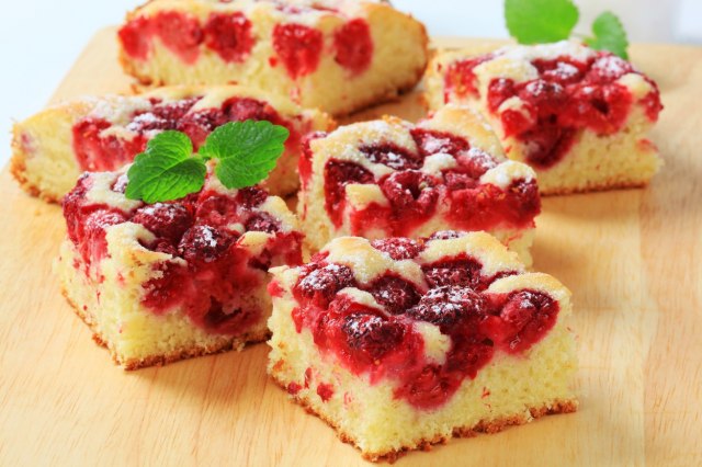 Peći 10 minuta, pa izvaditi i staviti voće na vrh testa kako ne bi palo na dno. Vratiti u rernu i peći još 20 minuta (ukupno 30).