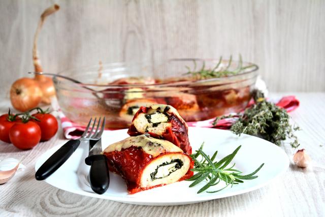 - Blitvi odstranite tvrđi deo i blanširate je. Sastavite po 2-3 polovine blitve. Preko blitve stavite sitno izrendan kačkavalj, a onda i parče sira. Urolajte i tako urolano stavite na piletinu i sve zajedno ponovo urolajte. Piletinu malo premažite uljem i još malo začinite, a onda ubacite u papriku. Na isti način napravite i preostalih 5 komada.