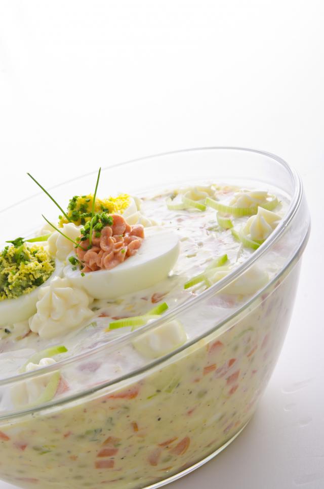 3 kuvana jaja, 250 g kuvane šunke, rendana šargarepa, 100 gr kuvanih makarona, preliv od majoneza, pavlake i senfa, so, biber