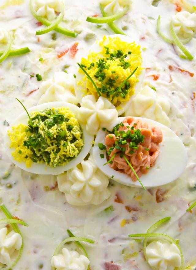 Smesom od žumanaca punite belanca, pospite preko mlevenu papriku i dekorišite po želji. Takođe, možete u fil da dodate i malo šunke, rena, pa da imate više ukusa za punjenje.
