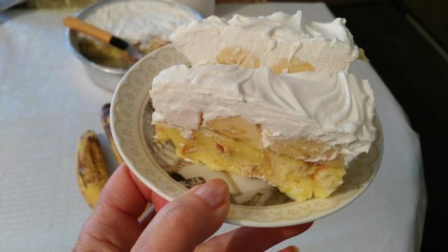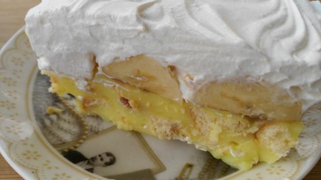 Banane iseći na pola po dužini i poređati po pudingu. Ostaviti da se prohladi dobro, pa ukrasiti šlagom.
