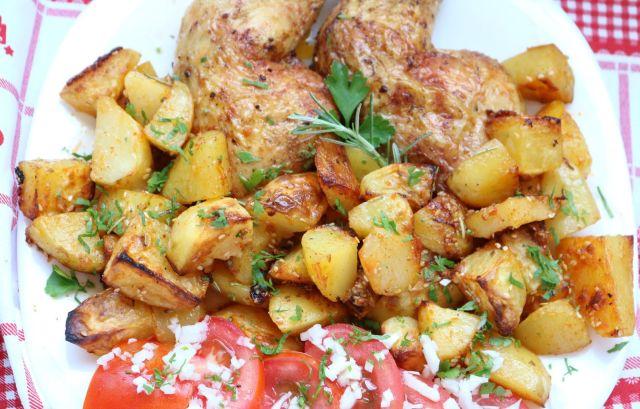 Krompir iseći na kocke pa i u njih dodati ulje, izdrobljen beli luk, ruzmarin, biber, susam, alevu papriku, začin i sve izmešati i staviti i rasporediti pored bataka i vratiti u rernu na 200 stepeni C oko 25 min da lepo porumeni.