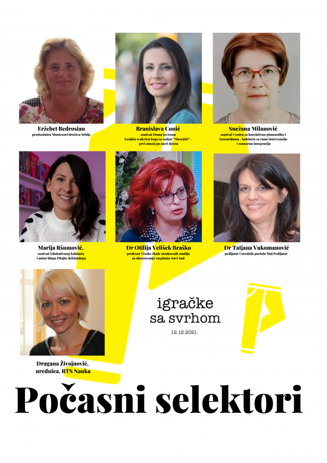 Odabir igračaka kojima će biti dodelja Titula IGRAČKE SA SVRHOM, obavlja tim počanih selektora sastavljen od priznatih i dokazanih uglednih pojedinaca iz oblasti društveno odgovornog poslovanja, brige o dobrobiti dece, zdravstva, kulture i obrazovanja.