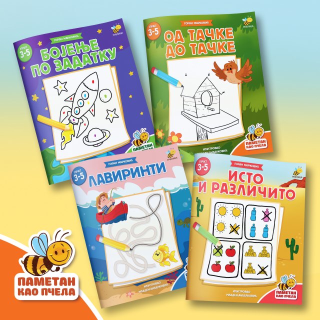 Edicija radnih svezaka Pametan kao pčela kroz različite oblike aktivnosti namenjenih mališanima uzrasta od 3 do 5 godina pozitivno utiče na njihovu finu motoriku, koordinaciju oka i ruke, preciznost, izoštravanje percepcije, uočavanje delova i njihove veze unutar celine.