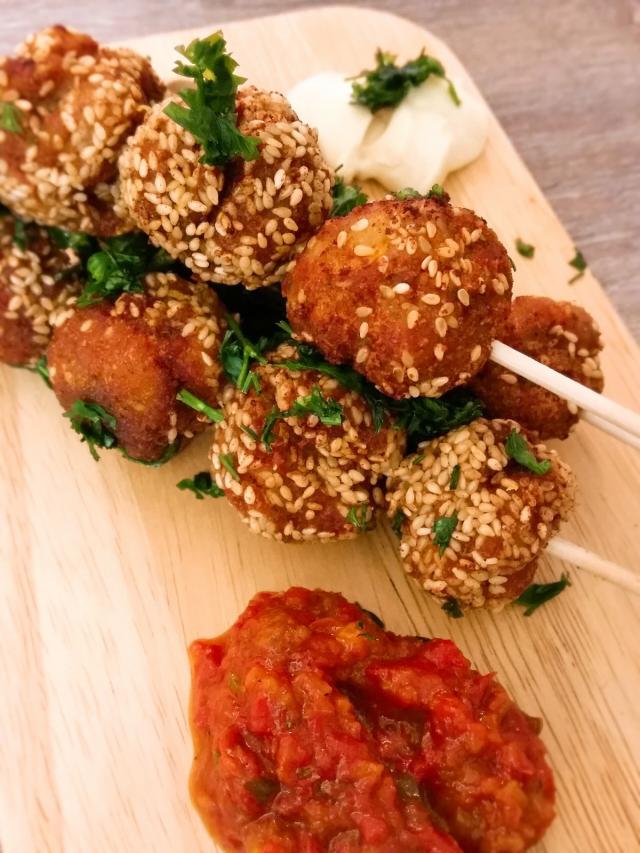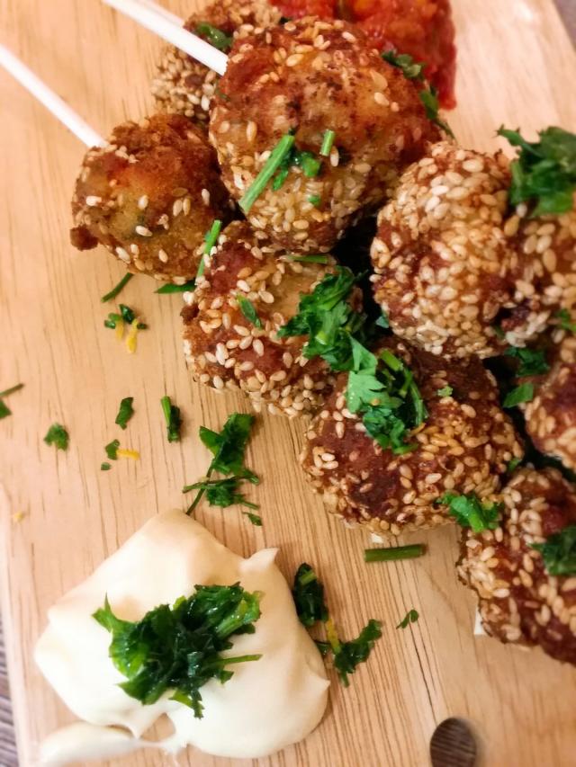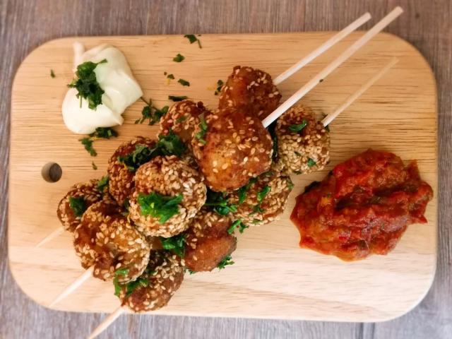 Od toga napraviti kuglice, pa ih uvaljati u prezle i susam.